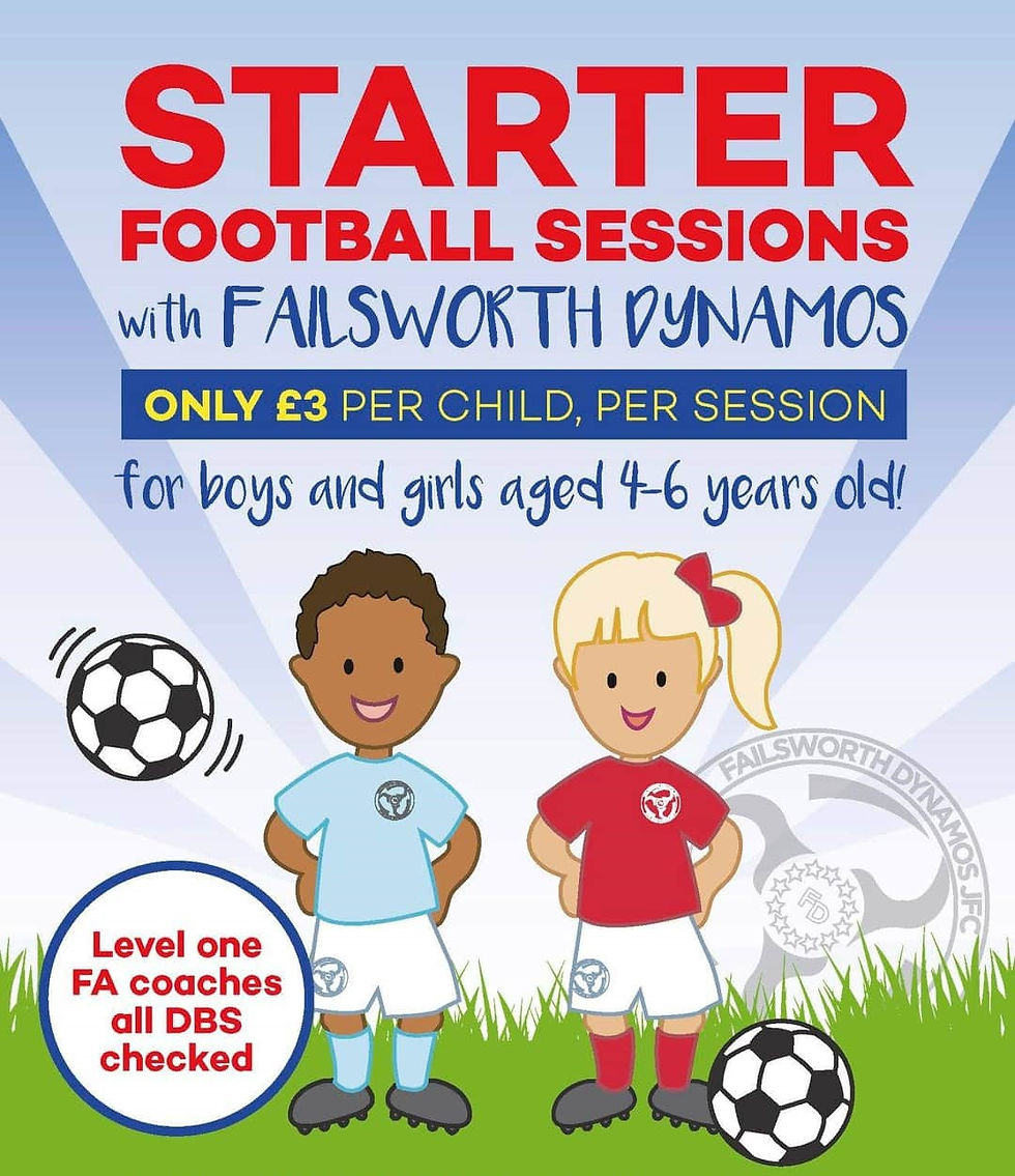 Starter football sessions with Failsworrth dynamos, only £3 per child, per session for boys and girls aged 4-6 years old!